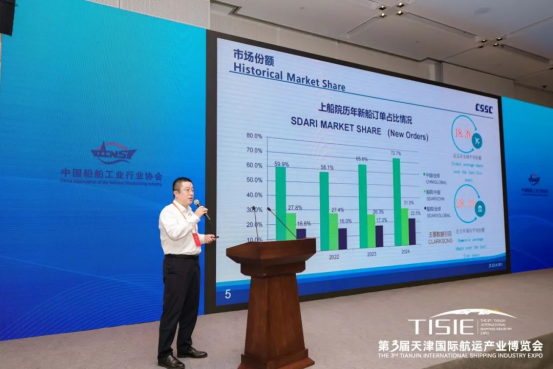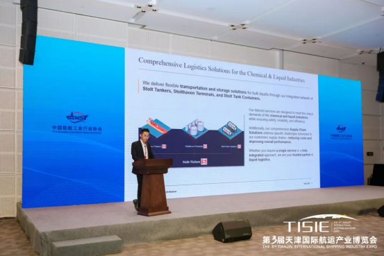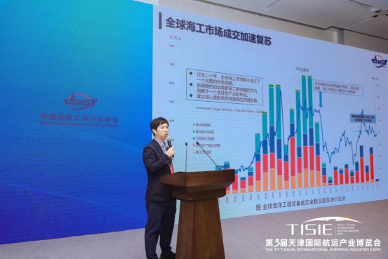 主题演讲环节,多位重量级嘉宾带来了精彩分享。天津东疆综合保税区融资租赁促进局副局长康效齐以“东疆船舶海工租赁产业发展创新与实践”为题,分享了东疆综合保税区在船舶海工租赁领域的创新模式与成功实践,展示了区域发展的蓬勃活力。中国船舶工业行业协会修船分会秘书李新鑫聚焦“修船产业绿色转型之路”,深刻剖析了行业痛点与发展方向,为修船产业的可持续发展提供了思路。国家海洋信息中心经济室副主任孙瑞杰以“海洋经济发展形势与展望”为题,基于重点行业数据与前沿信息,为与会者描绘了海洋经济当前态势与未来图景。上海期货交易所商品一部高级经理张骋围绕“发挥期货市场功能,服务特钢行业高质量发展”,介绍了期货市场功能、钢铁期货市场运行情况,并探讨了金融工具如何有效支持实体经济,为船舶工业注入新动能。中海油能源经济研究院能源经济与政策研究中心海洋经济研究室主任李楠以“海洋新能源产业发展”为主题,介绍了海上风电、海洋油气以及海洋新能源与油气融合发展等领域的巨大潜力与广阔前景,为能源结构调整背景下的海洋产业指明了新机遇。思多而特集团亚太区业务发展总监Mark Lim以“全球一体化液体物流链”为题,介绍了公司的重点产品和服务,分享了国际视野下的物流链发展前沿动态。上海船舶研究设计院创新中心副主任/首席专家张卓介绍了“绿色环保船舶技术发展”,分享了国际环保政策法规的最新要求及其影响,介绍了公司在绿色船舶领域的创新成果与行业发展趋势。中国船舶工业行业协会统计信息部主任工程师张辉分享了“海洋工程装备产业发展情况”,分析了行业最新数据、下游需求等内容,并对未来海上风电、海洋油气等领域重点海工装备需求进行了讲解。