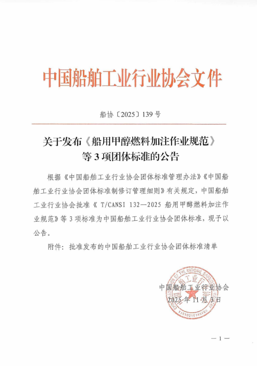 关于发布《船用甲醇燃料加注作业规范等3项团体标准的公告