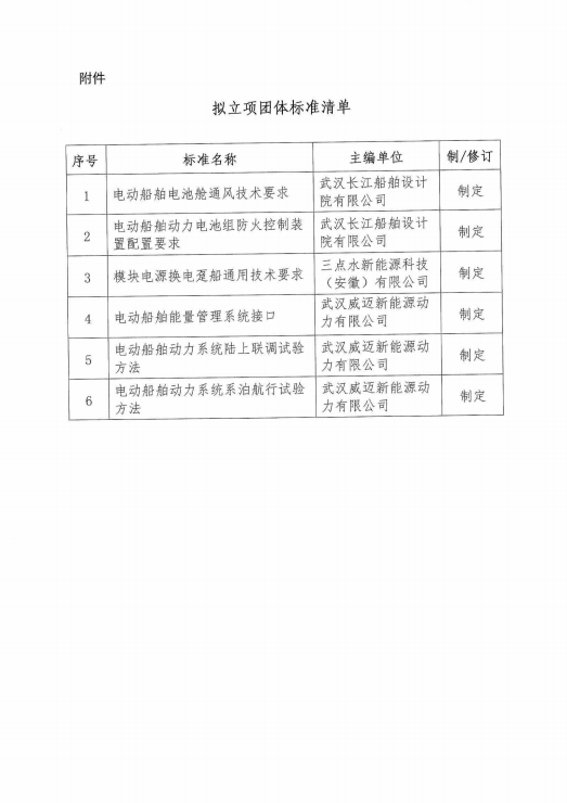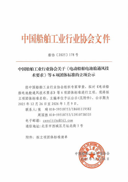 中国船舶工业行业协会关于《电动船舶电池舱通风技术要求》等6项团体标准的立项公示