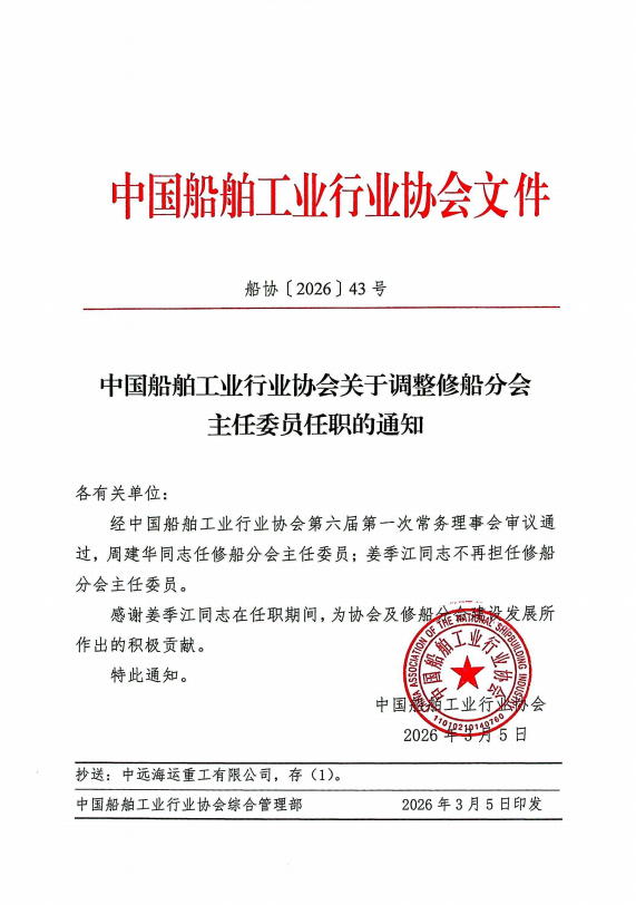 中国船舶工业行业协会关于调整修船分会主任委员任职的通知