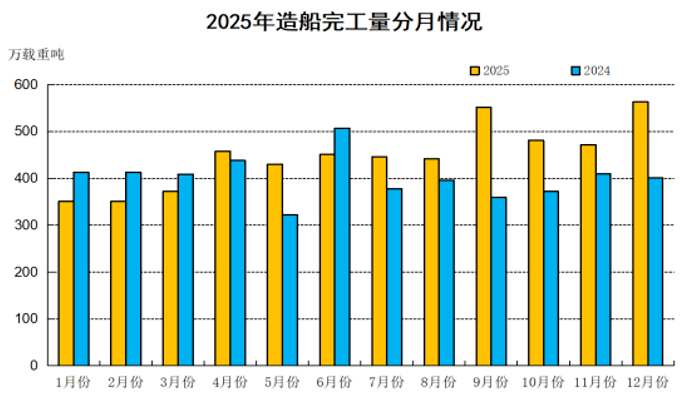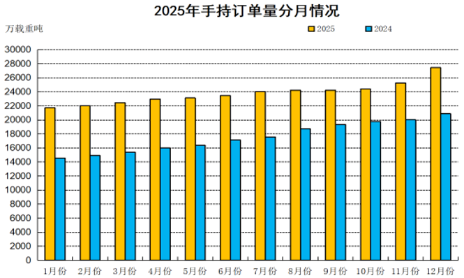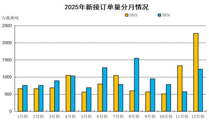 2025年,全国造船完工量5369万载重吨,同比增长11.4%;新接订单量10782万载重吨,同比下降4.6%。12月底,手持订单量27442万载重吨,同比增长31.5%。