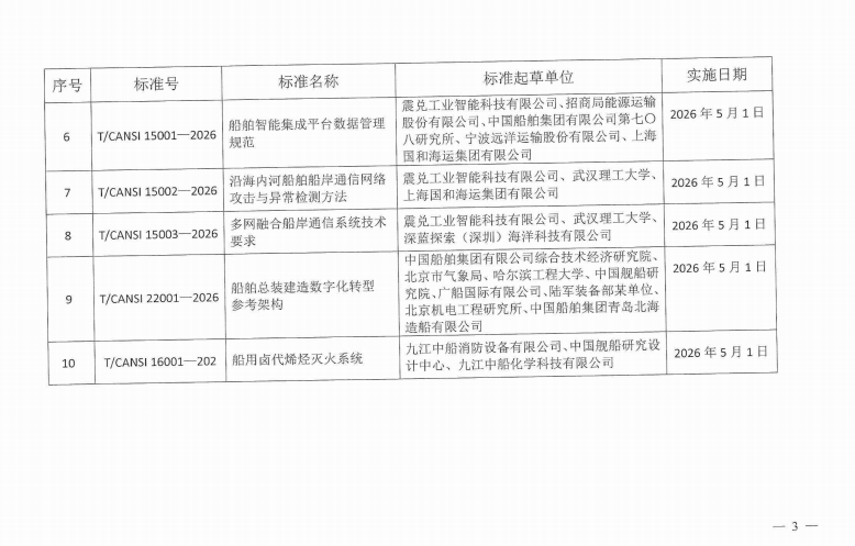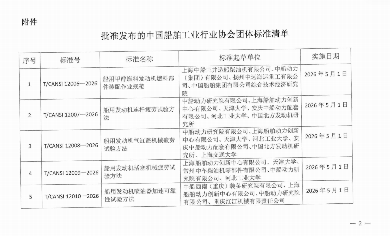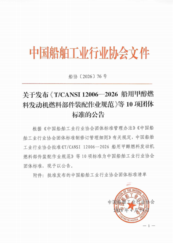 关于发布《T/CANSI 12006一2026船用甲醇燃料发动机燃料部件装配作业规范》等10项团体标准的公告