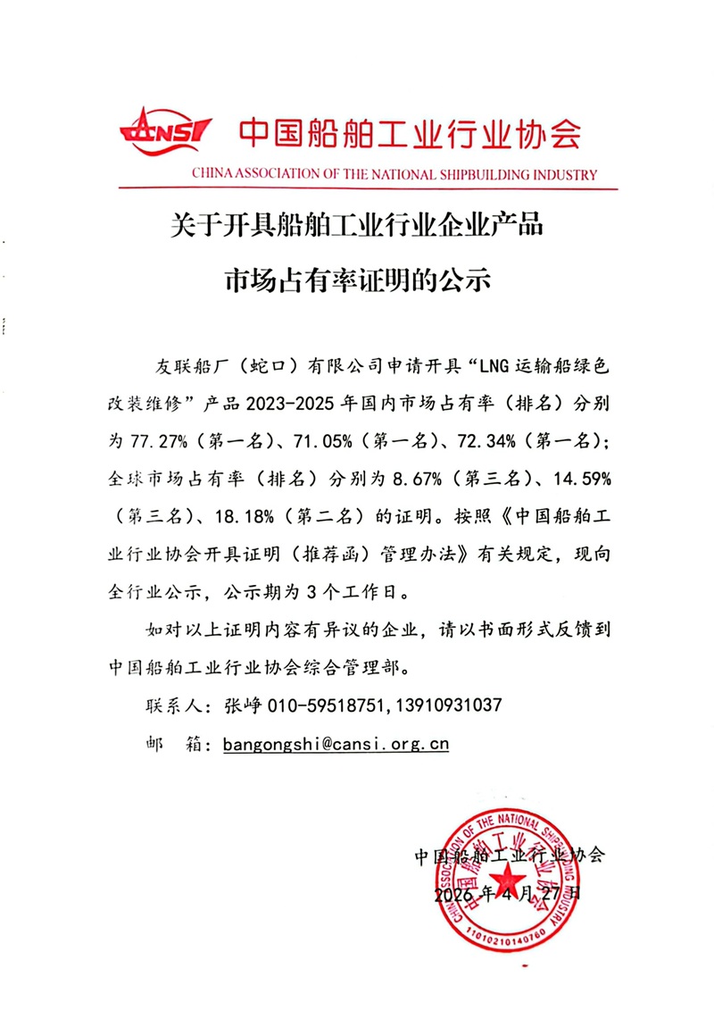关于开具船舶工业行业企业产品 市场占有率证明的公示