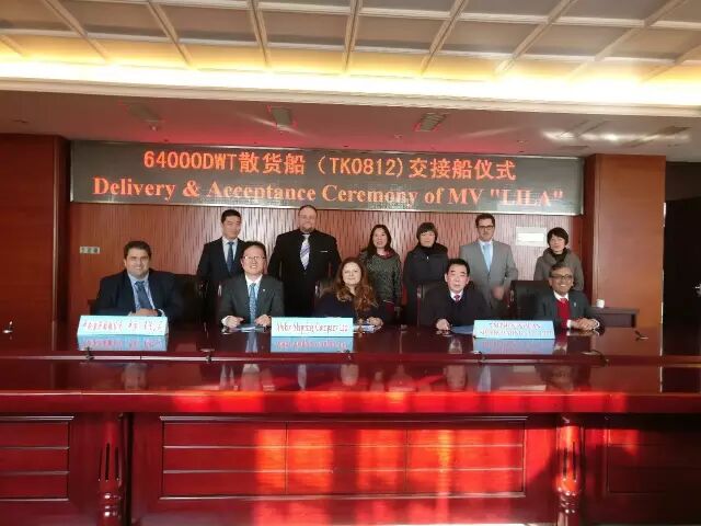 泰州:中航船舶代理、口岸船厂为希腊VERITAS船东集团建造的64000吨散货船LILA号签字交付。