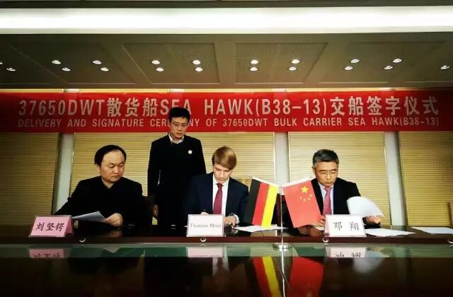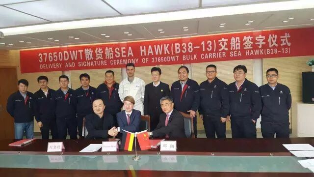 威海:中航船舶承接、中航威海为德国Reederei Roth船东集团建造的37650吨散货船SEA HAWK号签字交付。